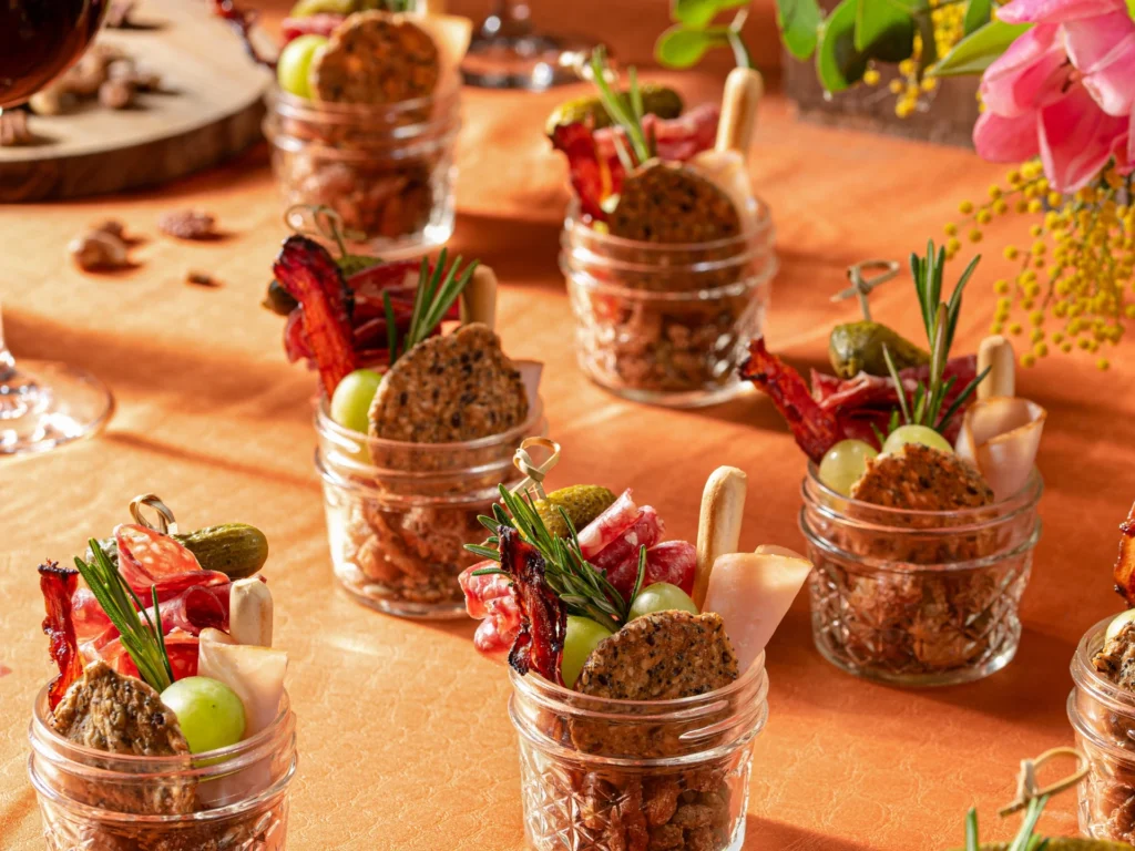 Jarcuterie is a single-serving charcuterie served in a jar! The concept became very popular in 2020, when serving party food on large platters was not so ideal. You can customize what goes in your jar however you like. I’ve included my favorite items below, served in 4-ounce Mason jelly jars. These can also be sent with your guests to go as mishloach manos.