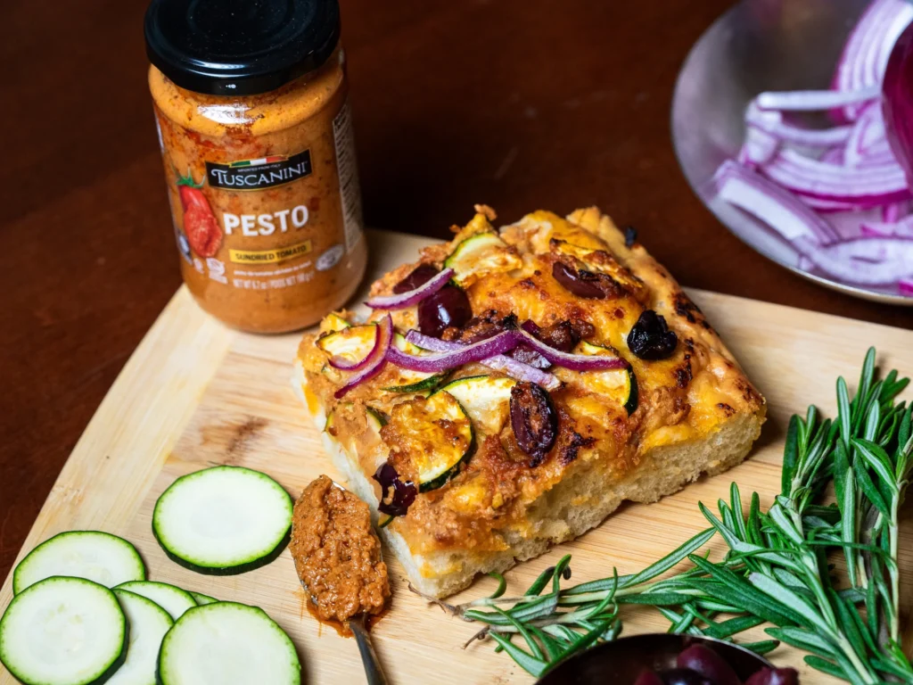 This is my favorite dough. I use it for flatbreads, focaccia, pizza, and calzones; It is a blank canvas which is only limited by your creativity. Spread with Tuscanini’s new sundried tomato pesto, it brings a piquant edge to this flatbread. Try topping it with some feta for a dairy meal, or for a meat meal use leftover chicken or beef strips.