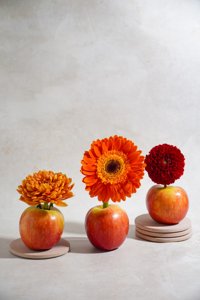 Turn apples into charming bud vases by carefully coring out the top and inserting a few small blooms. Think petite roses, carnations, baby’s breath, or even fresh herbs like rosemary for a fragrant touch. Arrange them along the table for a natural, whimsical centerpiece that ties back to the harvest season.