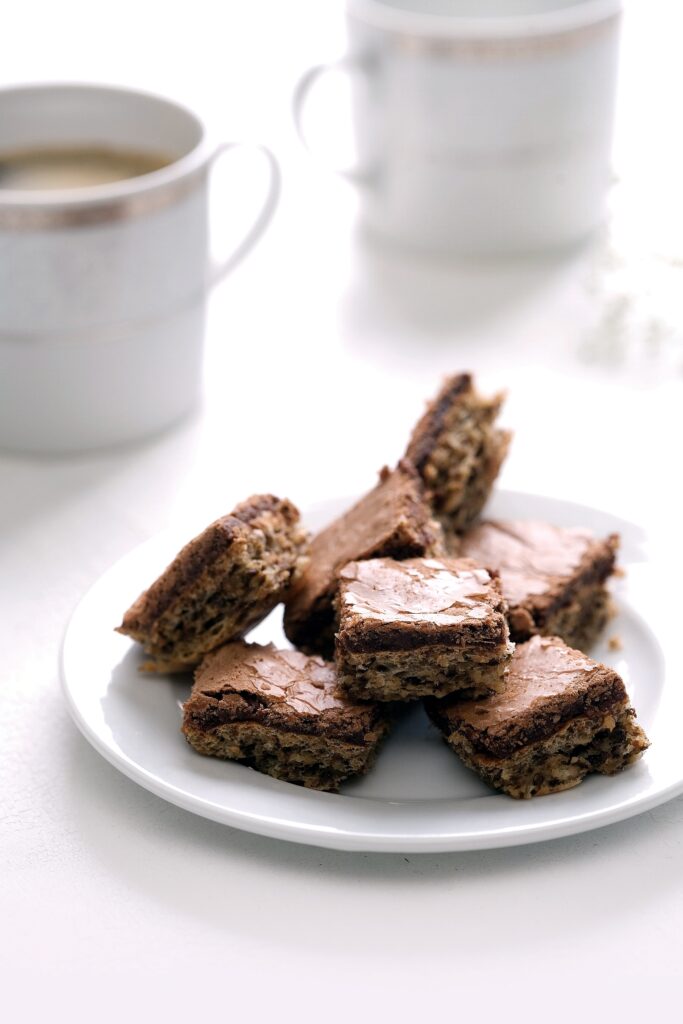 These squares are a delectable addition to any cake platter. They are very rich, so cut small portions. They taste best served cold, although at the photo shoot we all ate them room temperature, and finished the entire plate!