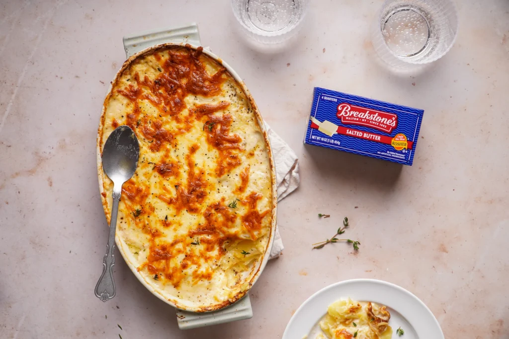 Scalloped potatoes is the indulgent dish you’ve been looking for. It’s the perfect special-occasion side that will complement any dairy menu, making it especially perfect for your Chanukah parties. Using great ingredients like white wine and creamy, rich Breakstone’s Butter makes these humble potatoes really shine.