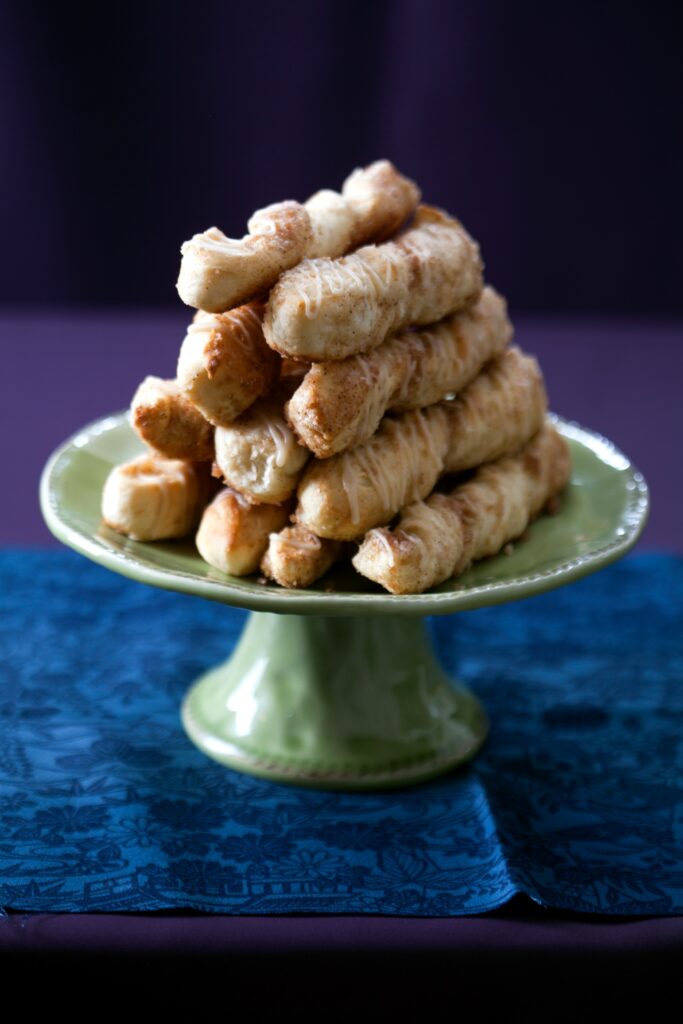 Soft and moist pastry twists with all the flavors of cinnamon buns in small bites. They're amazing! Even better, the recipe yields a relatively large amount.
