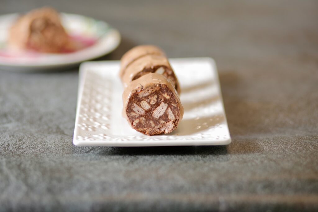 This classic Hungarian dessert, sometimes called "Salami Cake," is always a hit! Using both brown and white tea biscuits makes this "cookie" so much prettier. Store the finished logs in the freezer, wrapped in parchment, and take out and slice as needed. They won't last very long!