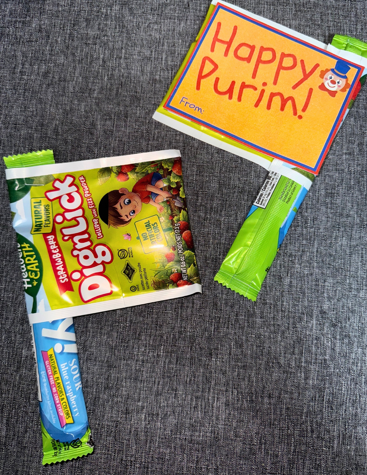 We printed a paint palette with “Have a Very Colorful Purim!” and matched each “paint spot” with a coordinating Lil’ Taffy flavor. The bright wrappers become the “paint,” making it look like a real artist’s palette — but way sweeter.