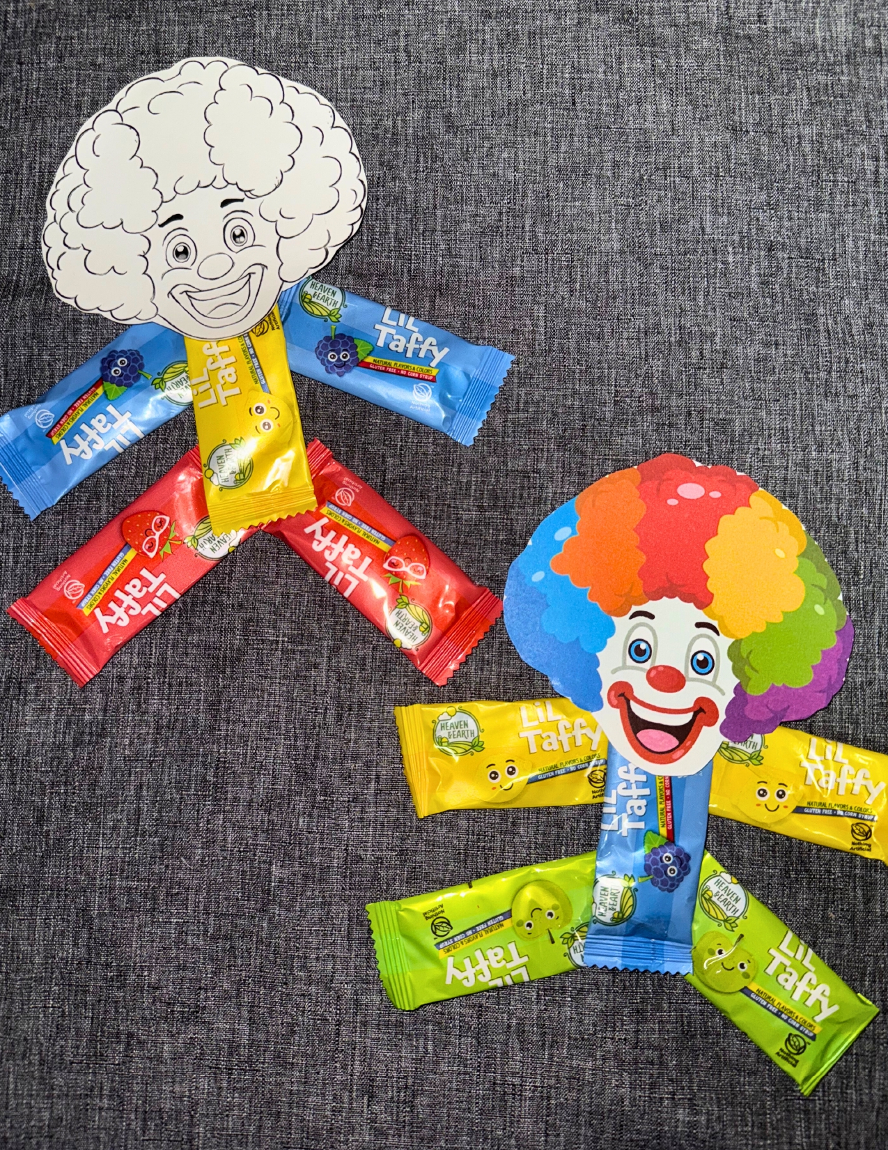 We turned Heaven and Earths taffies into the happiest little clown by using the candies as arms, legs, and a body — and topped it off with a big colorful clown face (or let the kids color their own for extra fun!)