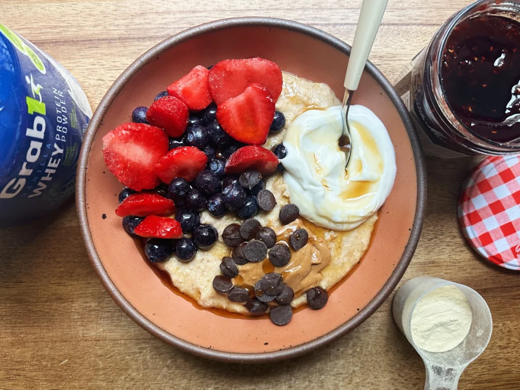 This is my go-to breakfast most mornings, a hearty bowl of oatmeal with all the toppings. Adding protein powder to the oats makes this extra satiating, and almond milk adds creaminess. I like topping this with frozen berries and chocolate chips- both melt into the hot oats, making for a breakfast that’s truly comforting on a winter morning.