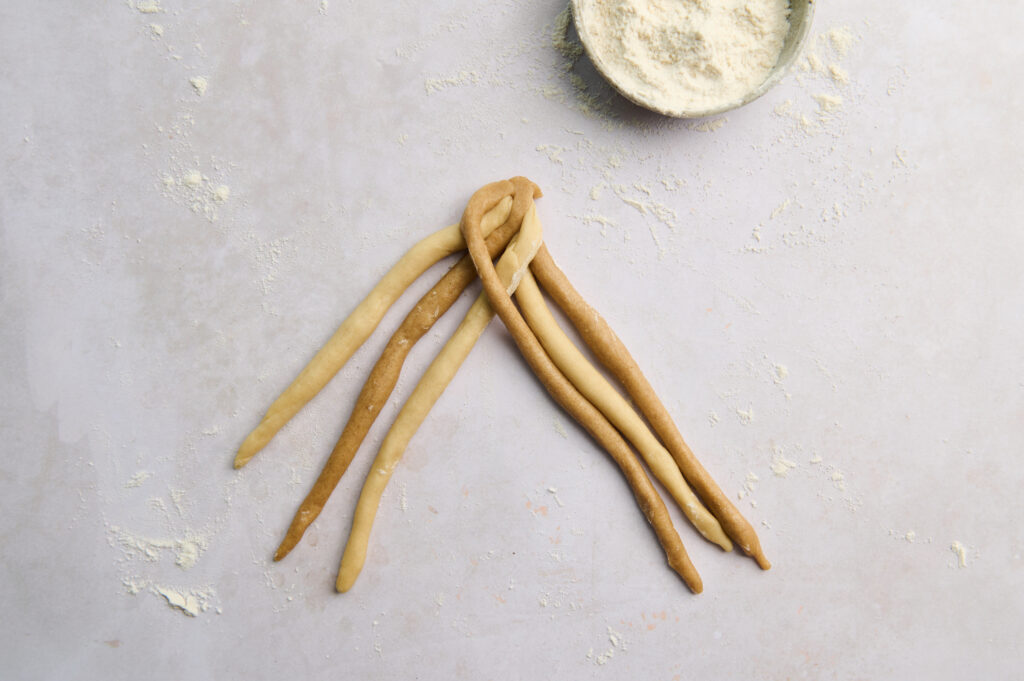 1. Separate 6 strands of dough, with each strand weighing about 10–12 grams. Roll each into a rope about 10–12 inches long.