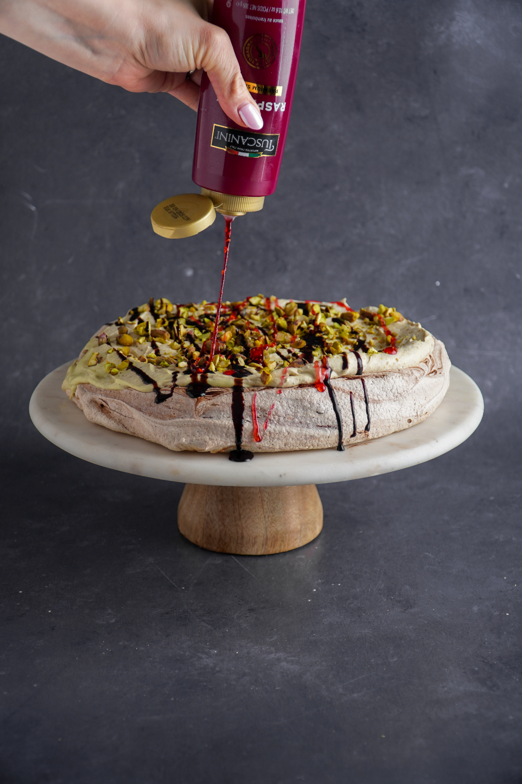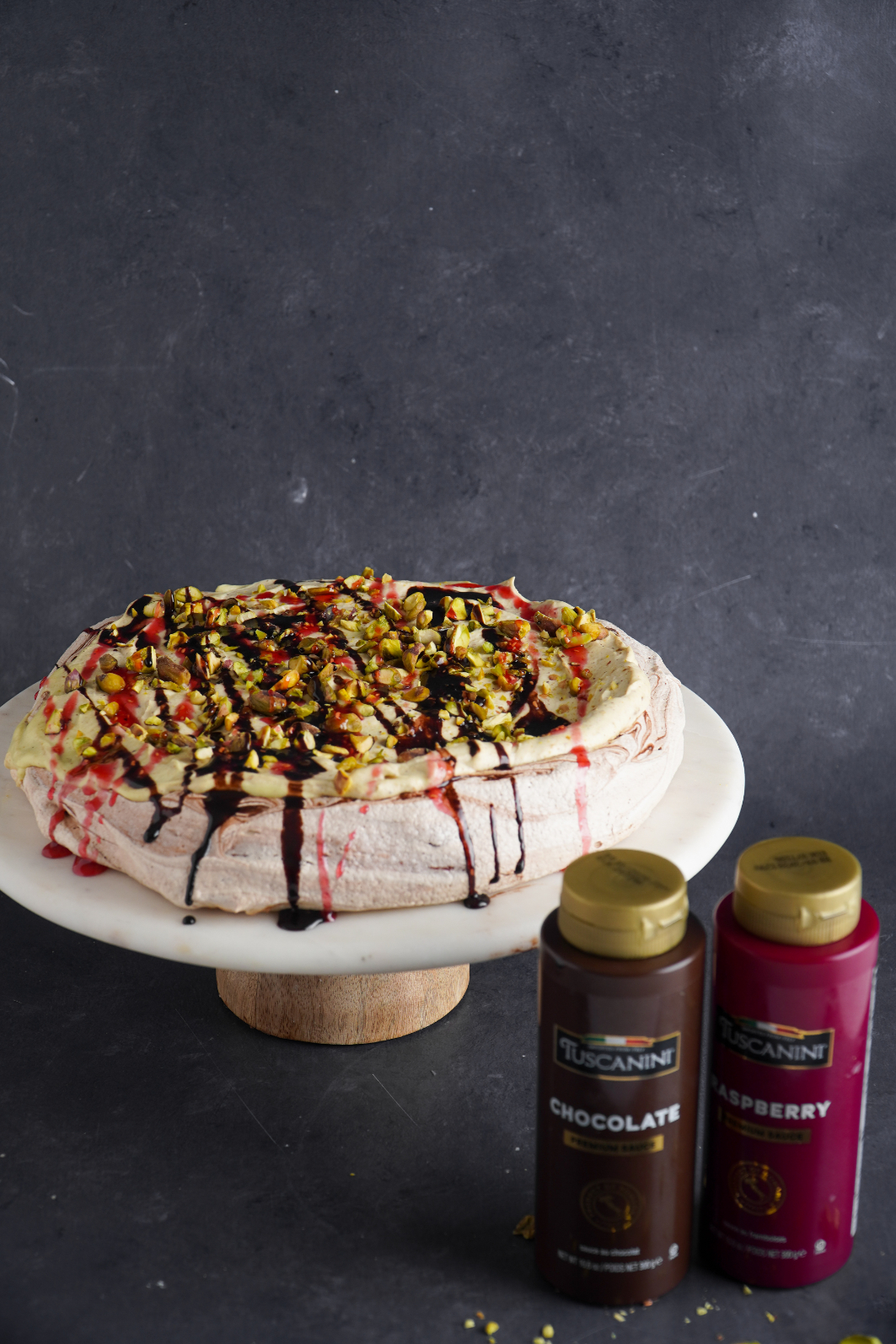 This Dubai Chocolate Pavlova is swirled with rich Tuscanini chocolate syrup, creating beautiful ribbons of deep cocoa flavor throughout the crisp meringue. Once baked and filled with a creamy pistachio cream, it’s drizzled generously with more Tuscanini chocolate syrup and finished with vibrant Tuscanini raspberry syrup for that perfect sweet-tart contrast and stunning pop of color. The glossy drizzle against the snowy pavlova makes it feel luxurious, playful, and absolutely Purim-ready.