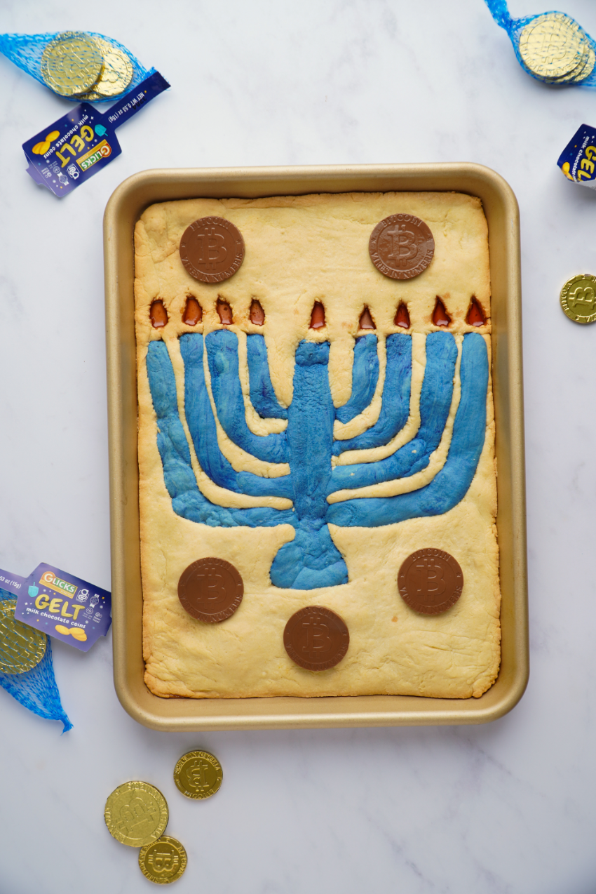Simply cut out a menorah shape, fill it with a different color dough, sprinkle in some playful crushed Heaven & Earth candies for the flames, and finish it off with a touch of gelt. It’s part baking project, part holiday art, and completely irresistible. Whether you slice it like bars or bring it straight to the table as a showstopper, this cookie brings pure Chanukah joy.