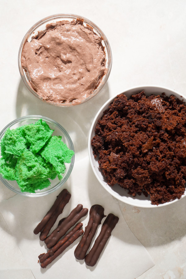 Tear green angel food cake into fluffy, irregular pieces (this gives the most natural, leafy look). Use kitchen scissors for a more symmetrical, rounded shape. Gently press the pieces onto the top of the pretzel trunk, using melted chocolate as “glue”. Allow to dry.