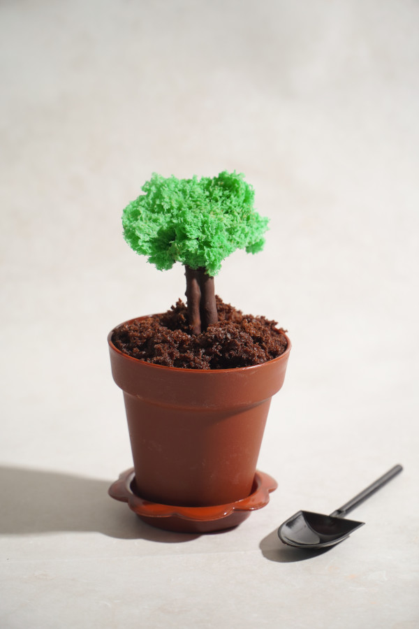 Spoon a layer of chocolate cake crumbs into the bottom of each planter cup. Add a smooth layer of chocolate mousse on top, followed by one more layer of each. Then finish with more cake crumbs to fully cover the mousse. This gives the look of rich, dark earth.