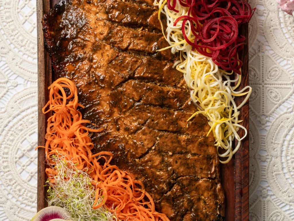 It’s a welcome change from the usual braised or slow-cooked meats often served on Yom Tov. It’s lighter in texture, yet full of depth and flavor. This dish can be prepared fresh right before your meal or made ahead and slow-baked, allowing you to adapt it to your schedule without compromising on taste or presentation. Perfectly glazed and beautifully aromatic, this steak is a refined and memorable addition to your Yom Tov table.
