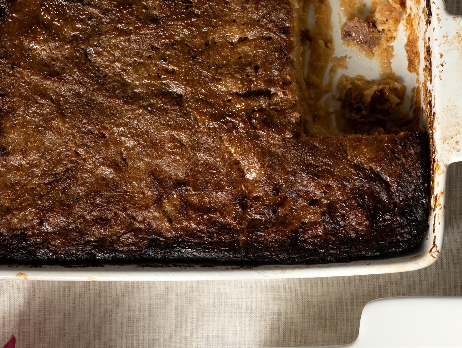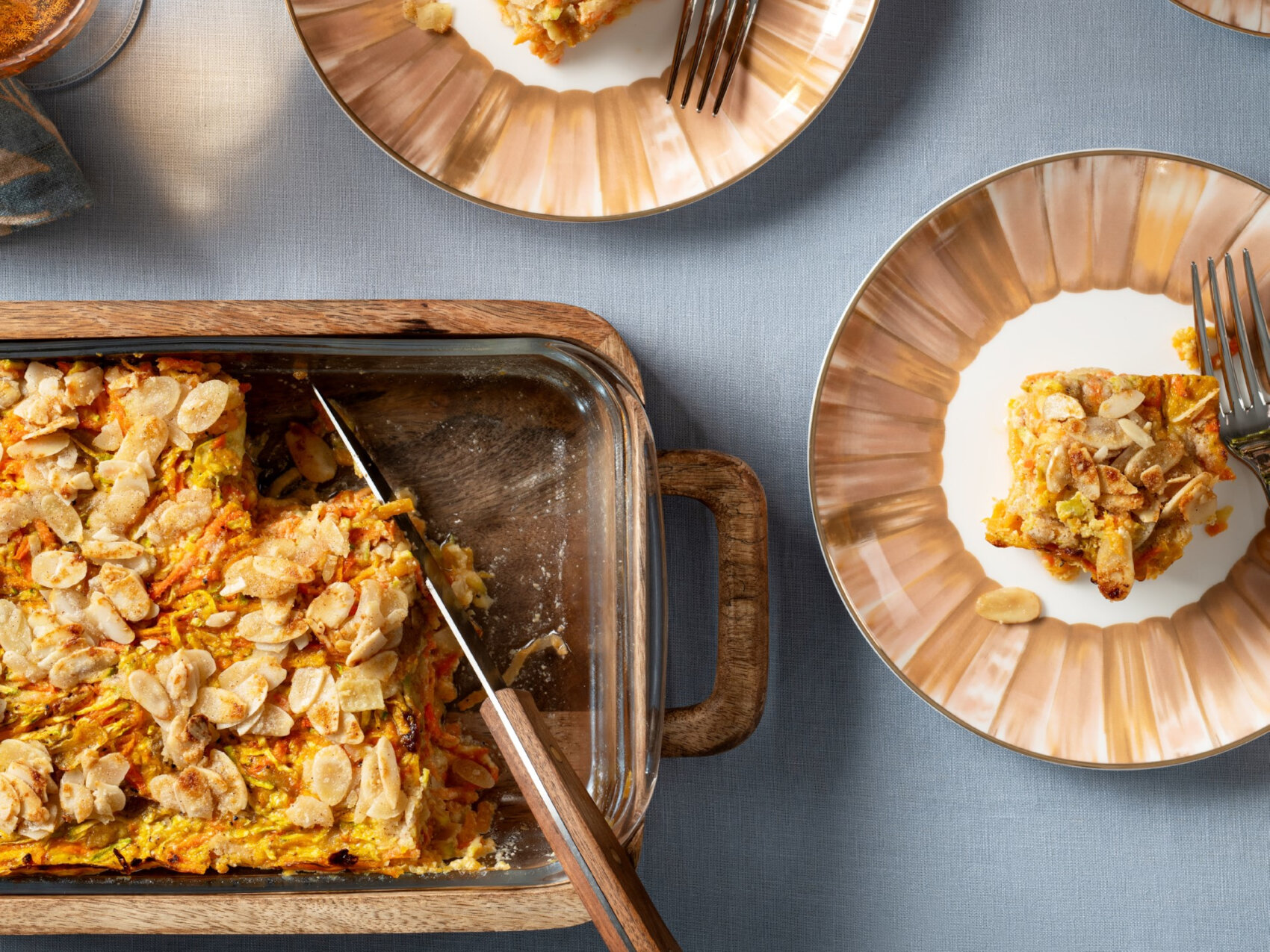 This is a moist and somewhat custardy vegetable kugel, as it’s thickened only with almond flour. Hidden between the savory layers is a slightly sweet layer seasoned with warm spices that permeates the entire kugel in a nuanced way. The crunchy topping takes it up a level. We couldn’t get enough of it and even ate it cold.