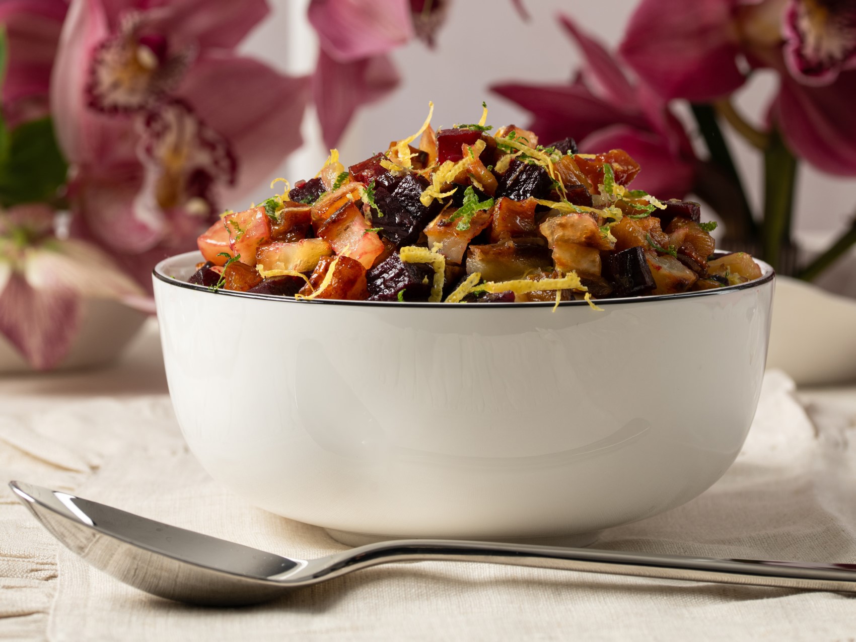 The gorgeous coloring in this delicious dish comes from the beets bleeding when roasted. There are recipes that become a popular hit in the family, and I believe that this fabulous side dish, with all its zesty flavor and flair, fits the bill!