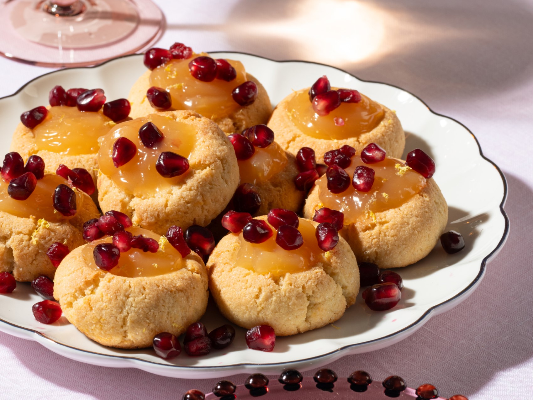 This is my most versatile cookie dough recipe. We printed it in the magazine a few years ago in a horn shape (with the ends dipped in chocolate) and a similar version last year as black and white sticks. My favorite of all is to make it with jam in the middle, or as shown here, with lemon curd dolloped in and garnished with pomegranate arils.