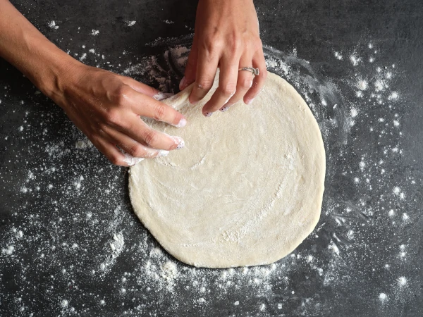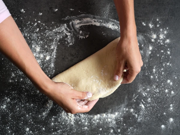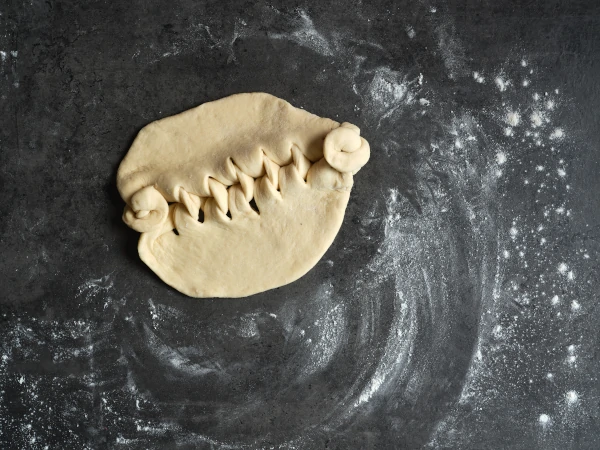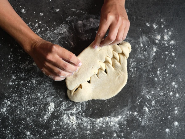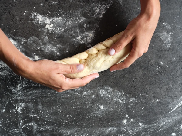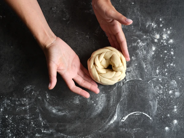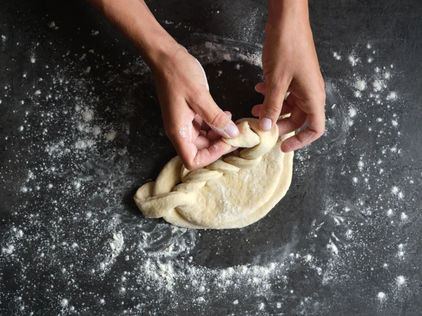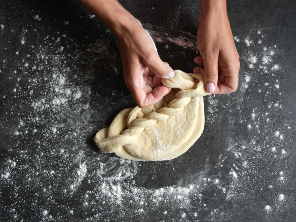 And then close up the challah by pulling one edge over the other and pinching the ends together.