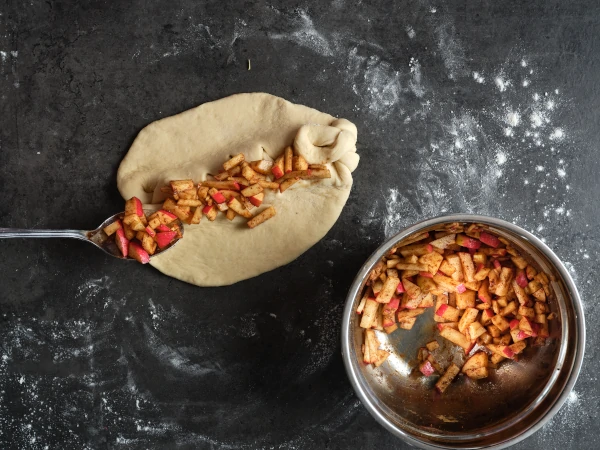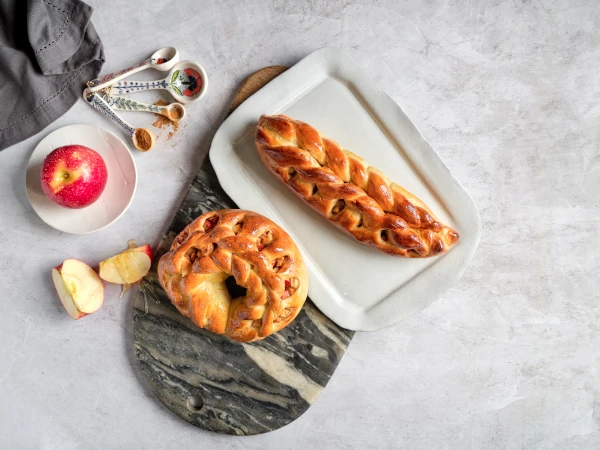 This creative “switch” braid reveals swirls of tender, spiced apple filling in every slice, making it the perfect centerpiece for Rosh Hashanah. Makes 2 challahs