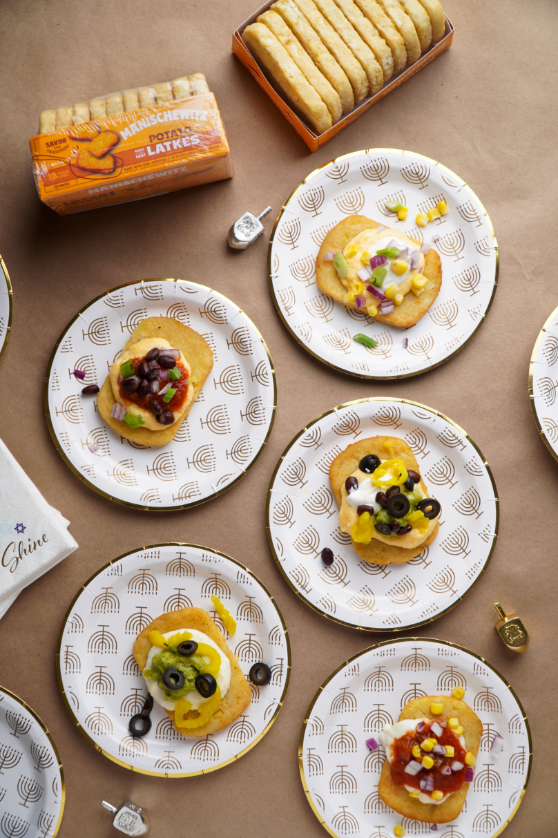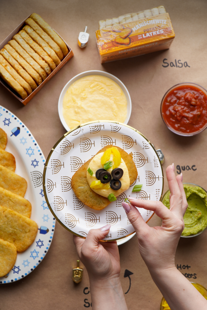 It’s exactly what it sounds like. Crispy Manischewitz frozen latkes standing in for tortilla chips, and every nacho topping you can dream up ready to pile high. It’s fun, it’s festive, and honestly, it’s one of the easiest party tricks you can pull off this Chanukah.