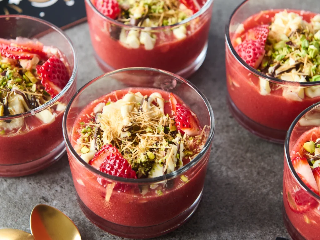These blended strawberry cups are a luxurious fusion of Dubai-style chocolate-dipped strawberry cups and the vibrant freshness of an açaà bowl. These layered treats start with a base of blended strawberries topped with creamy milk chocolate. Soft cheesecake cubes are tucked inside for a decadent surprise, and they’re topped with a colorful crunch of chopped pistachios and golden, crispy kataifi dough. Each spoonful delivers a perfect mix of creamy, crunchy, sweet, and tangy — an irresistible combo that’s as fun as it is delightful.