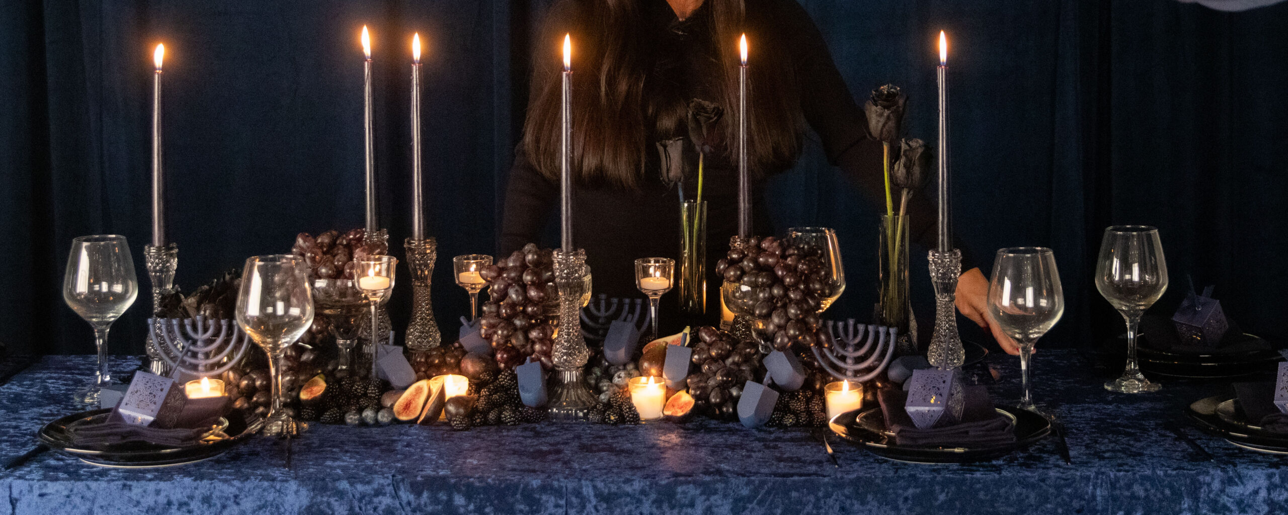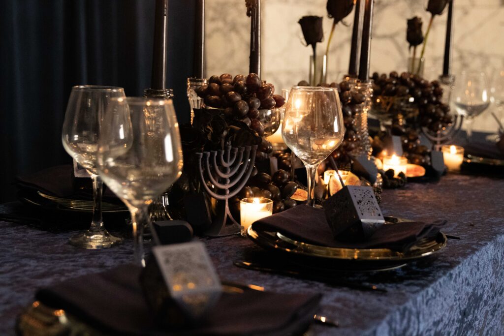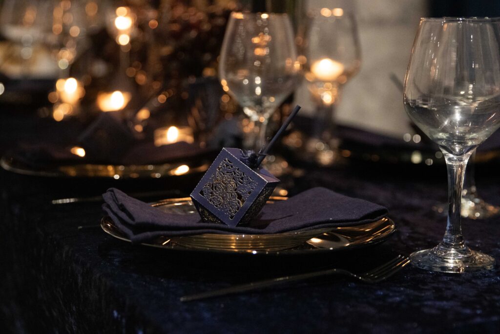 The table feels thoughtful, welcoming, and unmistakably Chanukah, layered with light, shadow, and small details meant to be discovered. And that, to me, is the beauty of hosting. Creating a space where people feel something the moment they sit down.