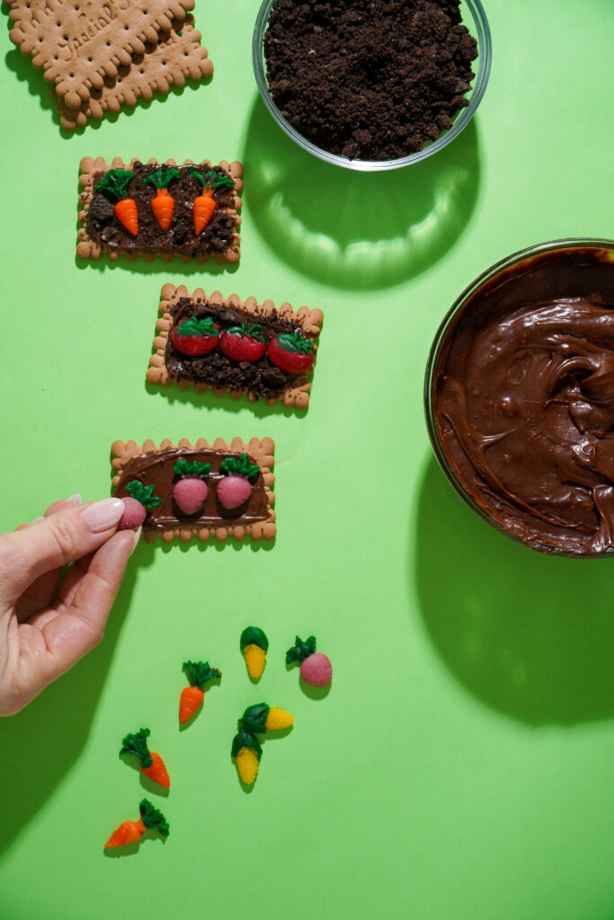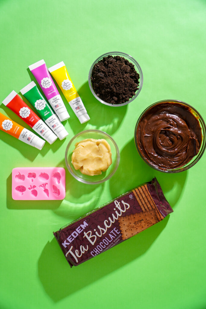 We’re making the cutest edible gardens to celebrate Tu Bishvat. They start with classic Kedem tea biscuits as the base, topped with chocolate frosting and cookie crumbs for “soil,” then finished with marzipan shapes that look just like a garden harvest. The result? A Tu Bishvat treat that’s almost too cute to eat (almost).