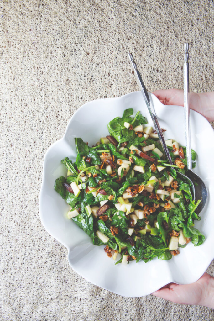 I wanted to include a version of charoset in my book, but I decided to take it a step further, so I created this charoset-inspired salad, with all of the flavors you expect to find: cinnamon, wine, nuts, apples, and more. During our photoshoot preparation, the kitchen support staff all raved about this salad and kept wanting to remake it just so they could enjoy it again and again.