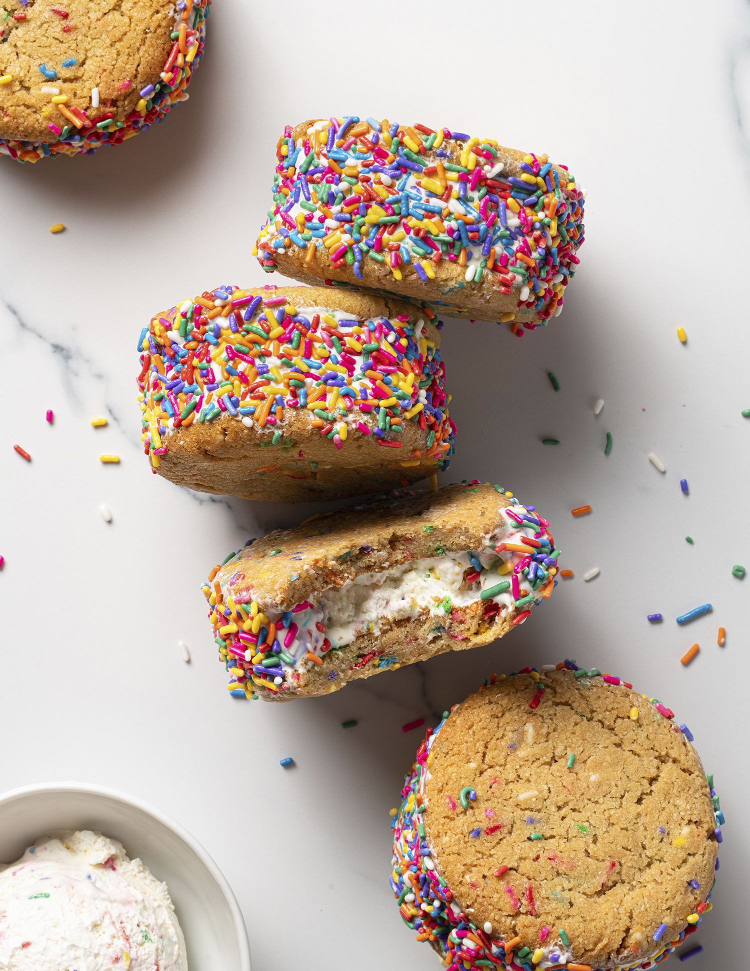 Large sprinkle-studded cookies + vanilla funfetti ice cream = the happiest handheld dessert. Perfect for kids!