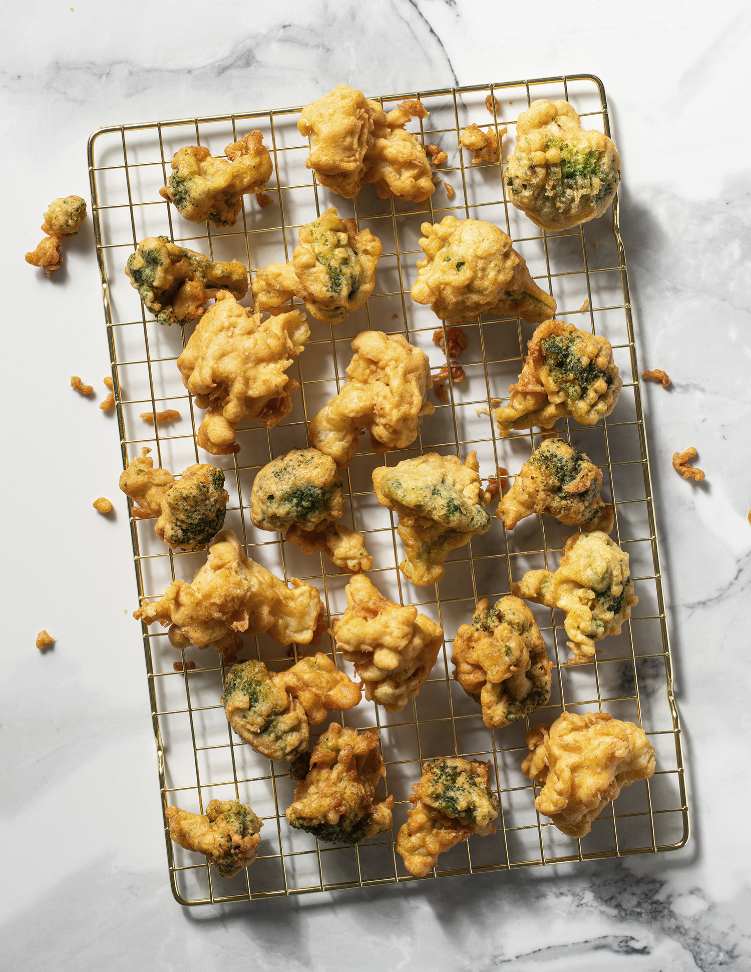 One of my seasonal chefs taught me this trick — use frozen, not thawed, broccoli and cauliflower. The cold vegetables help the batter cling and fry up extra crispy.