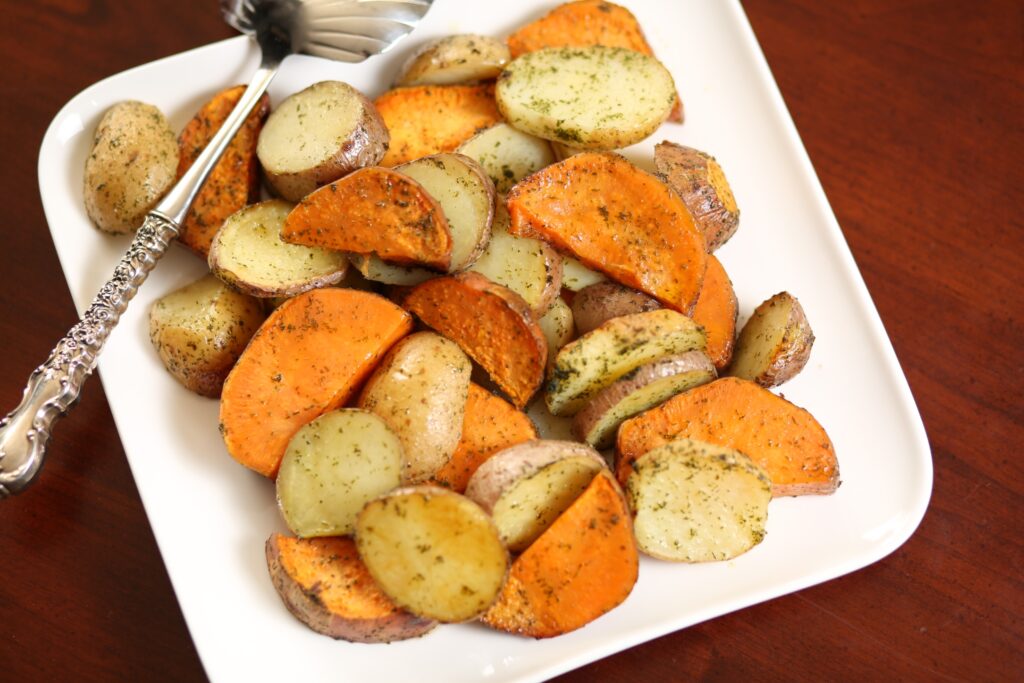 Comforting roasted potatoes. Leaving the skins on adds to the color in this medley.
