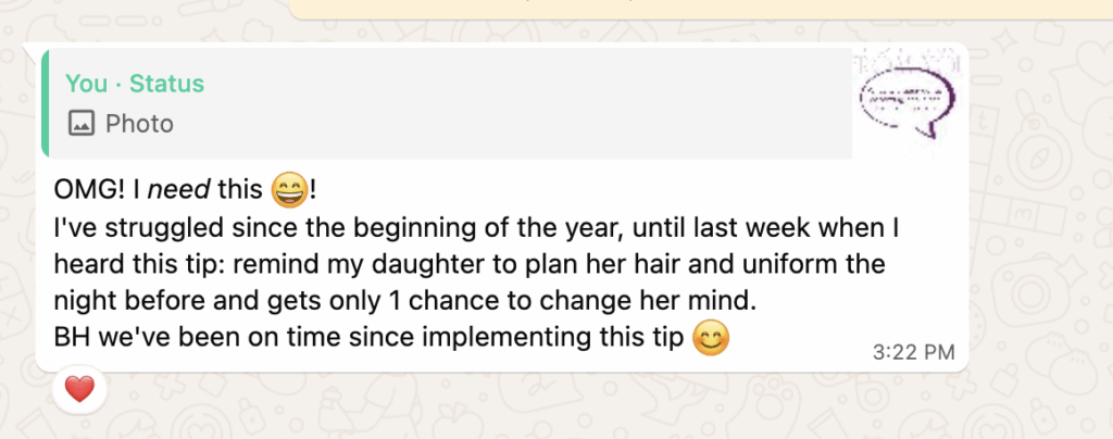 Every parent has their own secret formula for making mornings smoother. We posted a question on our WhatsApp status asking for everyone’s favorite morning rush tips. Here are the responses from REAL people (with genuinely amazing tips!).To join our WhatsApp group follow the link here!