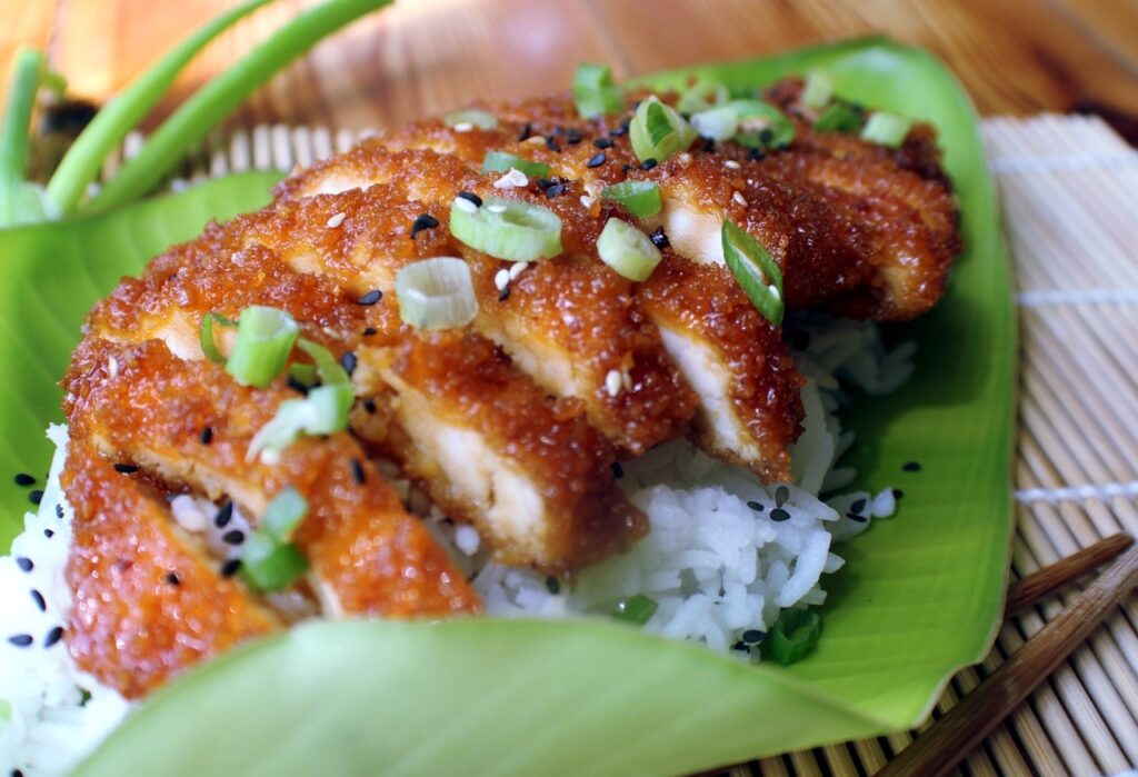 Chicken Katsu has its roots in the Japanese culture and, like many other Asian and Portuguese dishes, eventually found its way to the melting pot of Hawaii. It’s a highly popular dish for the island locals, and is often served with a side of white rice and mac salad. Here the cutlets are bathed in a sticky honey and garlic sauce, then sliced into thin strips and served on a bed of rice, with pops of color from scallions and black sesame seeds.