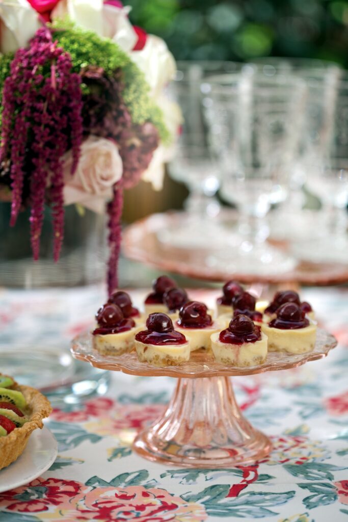 One-bite cheesecakes are a tantalizing appetizer and the parve cheesecake gems here are also dairy-free and topped with a scrumptious cherry each.