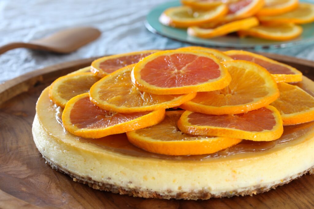 An elevated flavor profile makes these high-end Shavuot dessert treats a must-have: the cheesecake is topped with a brandy glaze and orange slices.