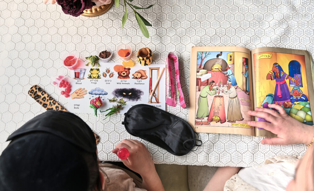 5. Roll up the mask and tie it with the elastics that it comes with for choshech. Bend it into a shape of a U to match the size of the doorway and put the taffy rope or fruit leather near it for bechoros.